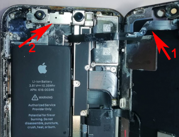 В сервисном центре ModMac нам сообщили, что у iPhone X после попадания внутрь жидкости почти во всех случаях перестает работать датчик Face ID. Связано это с тем, что сам модуль камеры и шлейф верхнего динамика «завязаны» на процессоре платы, который отвечает за исправную работу датчика. Под номером “1” вы можете найти шлейф слухового динамика, а под номером “2” — модуль фронтальной камеры.