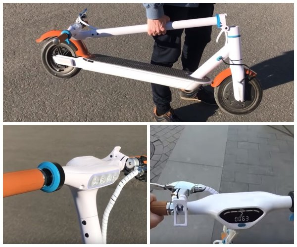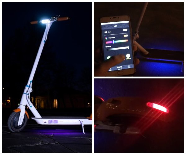 На руле самоката размесится небольшой экран, на котором отображаются уровень заряда аккумулятора, скорость движения, яркость фар и соединение с телефоном. Благодаря специальному приложению, пользователь может изменять цвет нижней подсветки и следить за картой местности. Все это, совместно с задним стоп-сигналом и передней яркой фарой предоставит человеку безопасность во время движения по трассе.
