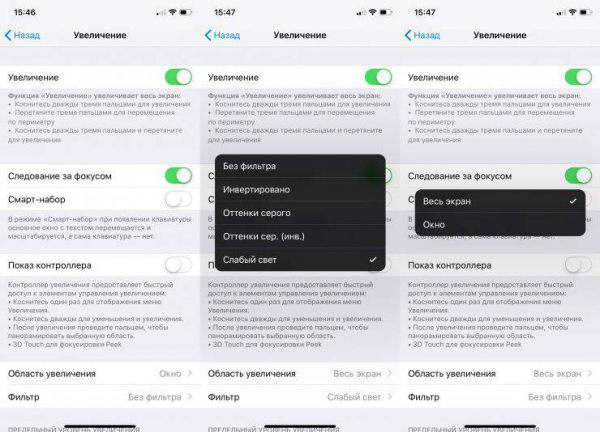 Для того, чтобы отключить этот режим, достаточно коснуться экрана тремя пальцами три раза, указав в появившемся меню «Выбрать фильтр» → «Без фильтра».