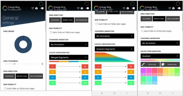 С помощью Energy Ring можно добавить круг настраиваемой длины для демонстрации уровня заряда смартфона. Кольцо, созданное с помощью приложения, может двигаться в нескольких направлениях: по и против часовой стрелки или двунаправленно. Главными настройками для пользователя станет возможность изменения толщины кольца. Чтобы гаджет выглядел еще более эффектно, можно активировать возможность добавления градиентов или разноцветных колец вокруг камеры. Приложение также показывает классные анимации каждый раз, когда подключается устройство для зарядки. Есть вариант также скрыть кольцо в приложениях, которые предлагают полноэкранный контент, например, в случае видео или потоковых приложений, галереи или игр. Energy Ring отображает уровень заряда аккумулятора при помощи изменения цвета, меняя его от зеленого до красного. Зеленый означает заряд на уровне от 76 до 100%, синий — от 75 до 51%, красный — менее 25%.