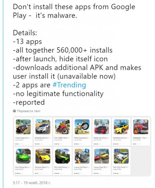 13 поддельных игр специалисты, создающие антивирусы, обнаружили в сервисе приложений для Android они были тщательно замаскированы под оригинальные игры, но разработчиком оказалась студия Luis O Pinto. Вредоносные программы пользователи скачали более полумиллиона раз и вирус начинал действовать, лишь когда получал разрешения на автозапуск при включении смартфона, использование сети и контроль всех подключений.