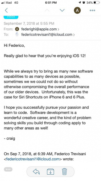 О том, что старые модели не будут поддерживаться платформой Siri Shortcuts стало известно после того, как один из пользователей портала Reddit решил задать вопрос по электронной почте руководству компании, касаемо доступности приложения на iPhone 6 Plus. Ответ последовал от вице-президента по программному обеспечению, Крейга Федериги.