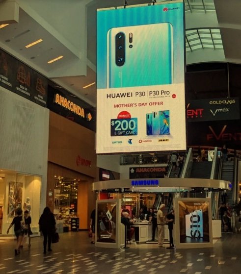 В Сети появилось фото большого рекламного табло, которое компания Huawei повесила прямо над официальным магазином Samsung в австралийском торговом центре. На билборде изображён флагманский смартфон Huawei P30. Пользователи обратили внимание, что баннер бросается в глаза с любой точки торгового центра. Ранее китайский концерн разместил свой билборд напротив билборда с флагманом Samsung Galaxy S10 в Дубае. Конкуренция двух гигантов продолжается, а значит, мы сможем насладиться качественными гаджетами и интересными решениями.